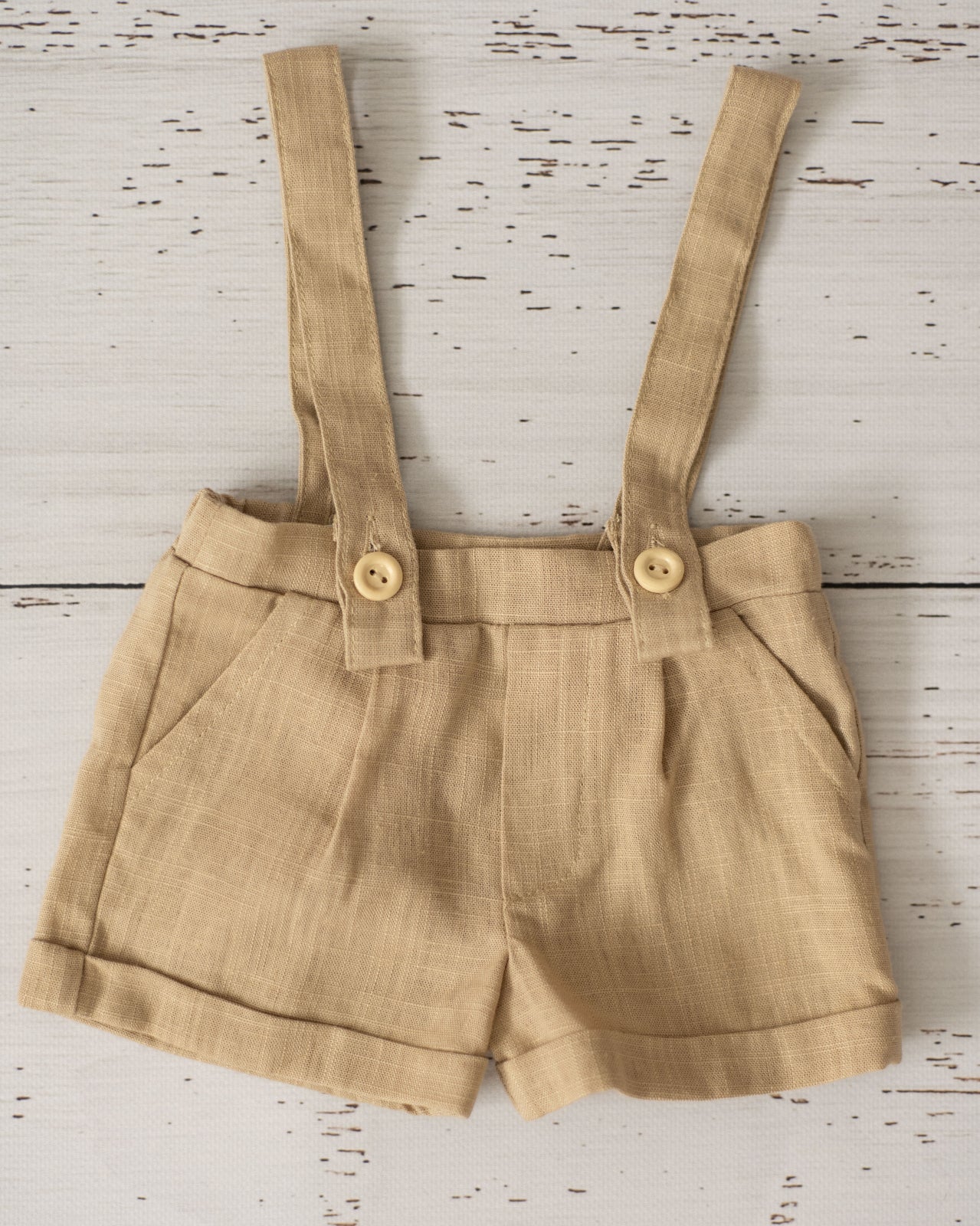 Pantalonașul scurt este confecționat din 100% in moale și lejer, accesorizat cu buzunărașe laterale și breteluțe detașabile.