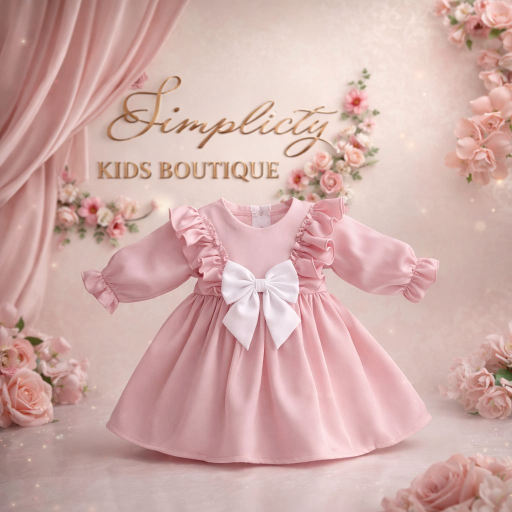 Rochita confecționată din tafta moale căptușită cu 100% bumbac, accesorizată cu dantela brodată, funda albă din organza în față și închidere cu fermoar la spate.