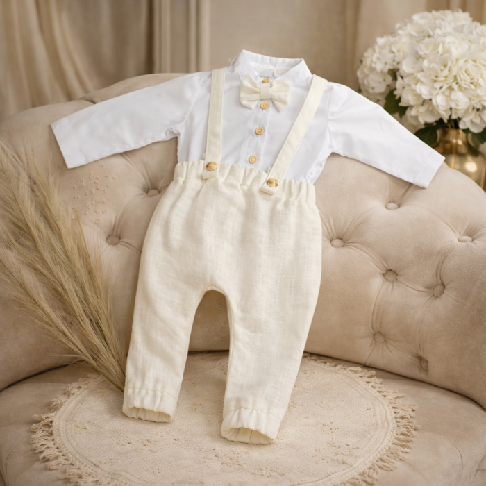 Setul este format din cămașa 100% bumbac și pantalonași Pantalonasii sunt accesorizati cu breteluțe detașabile, la baza piciorul au o manșeta elastică ce ofera posibilitatea de a fi purtati mai mult timp.