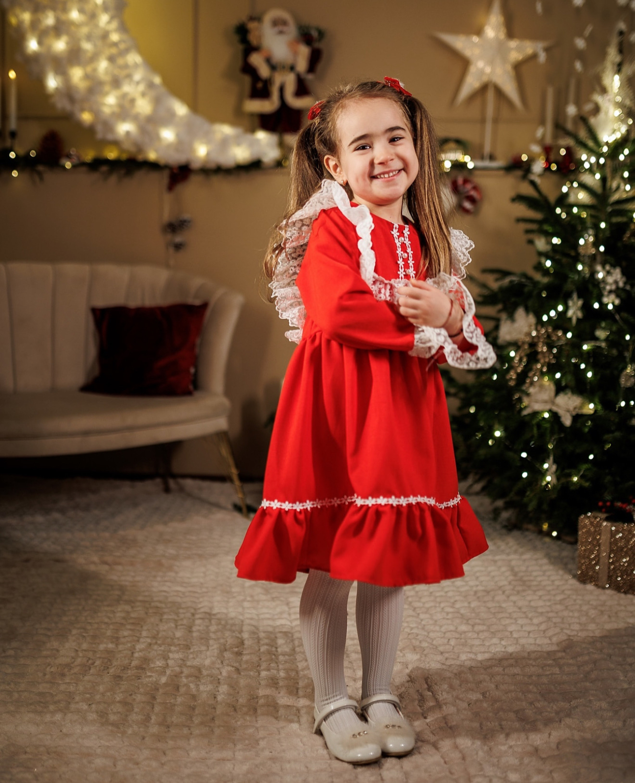 Rochita Selma este alegerea perfecta pentru sarbatorile de Craciun, oferind o combinatie unica de eleganta si confort. Aceasta rochie se remarca prin materialul sau de calitate superioara, perfect pentru pielea sensibila a celor mici. Cu un design rafinat, rochita este accesorizata cu doua straturi de dantela brodata fina, care adauga un plus de sofisticare.