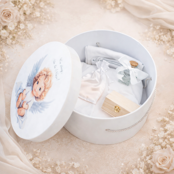 - Cutiuta din lemn pentru șuvița. Aceasta este necesara pentru a pastra suvita bebelusului la tunderea parului – pruncul este tuns in numele Sfintei Treimi – un ritual care simbolizeaza intrarea trupeasca in randul Bisericii.