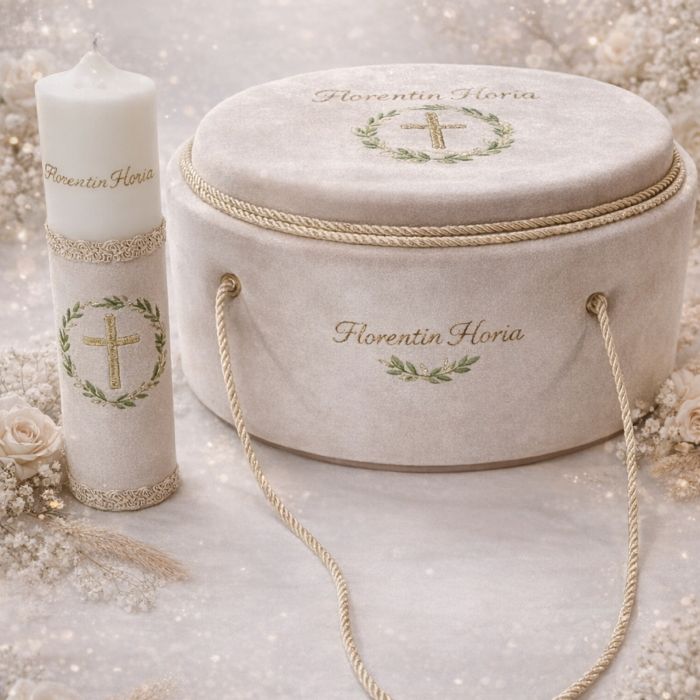 Cutiuta din lemn pentru șuvița. Aceasta este necesara pentru a pastra suvita bebelusului la tunderea parului – pruncul este tuns in numele Sfintei Treimi – un ritual care simbolizeaza intrarea trupeasca in randul Bisericii.