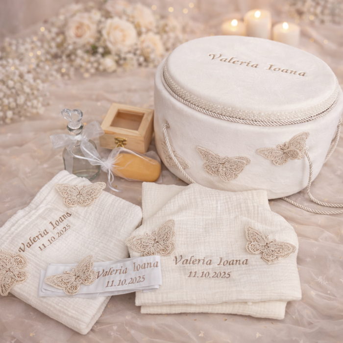 Personalizarea cu nume si/sau data pe piesele din trusou este gratuita. Se pot personaliza prosopul bebelusului, panza de Mir, fasa de botez. Capacul cutiei se poate personaliza contra cost.