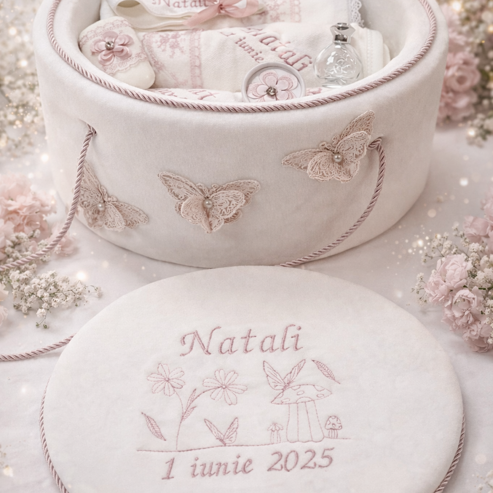 - Panza de Mir realizată dintr-un strat fin de muselina, pe care se poate broda numele bebelusului sau orice altceva. Dimensiune 1m x 1m.