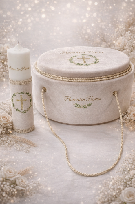 - Cutiuta din lemn pentru șuvița. Aceasta este necesara pentru a pastra suvita bebelusului la tunderea parului – pruncul este tuns in numele Sfintei Treimi – un ritual care simbolizeaza intrarea trupeasca in randul Bisericii.