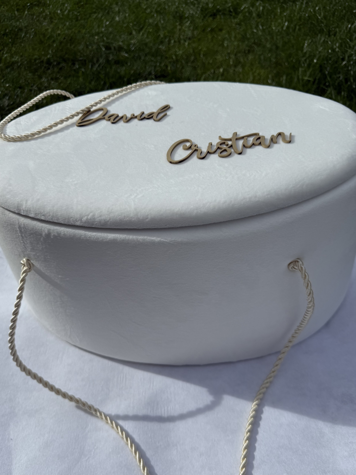 Trusou botez din catifea albă cu litere din lemn