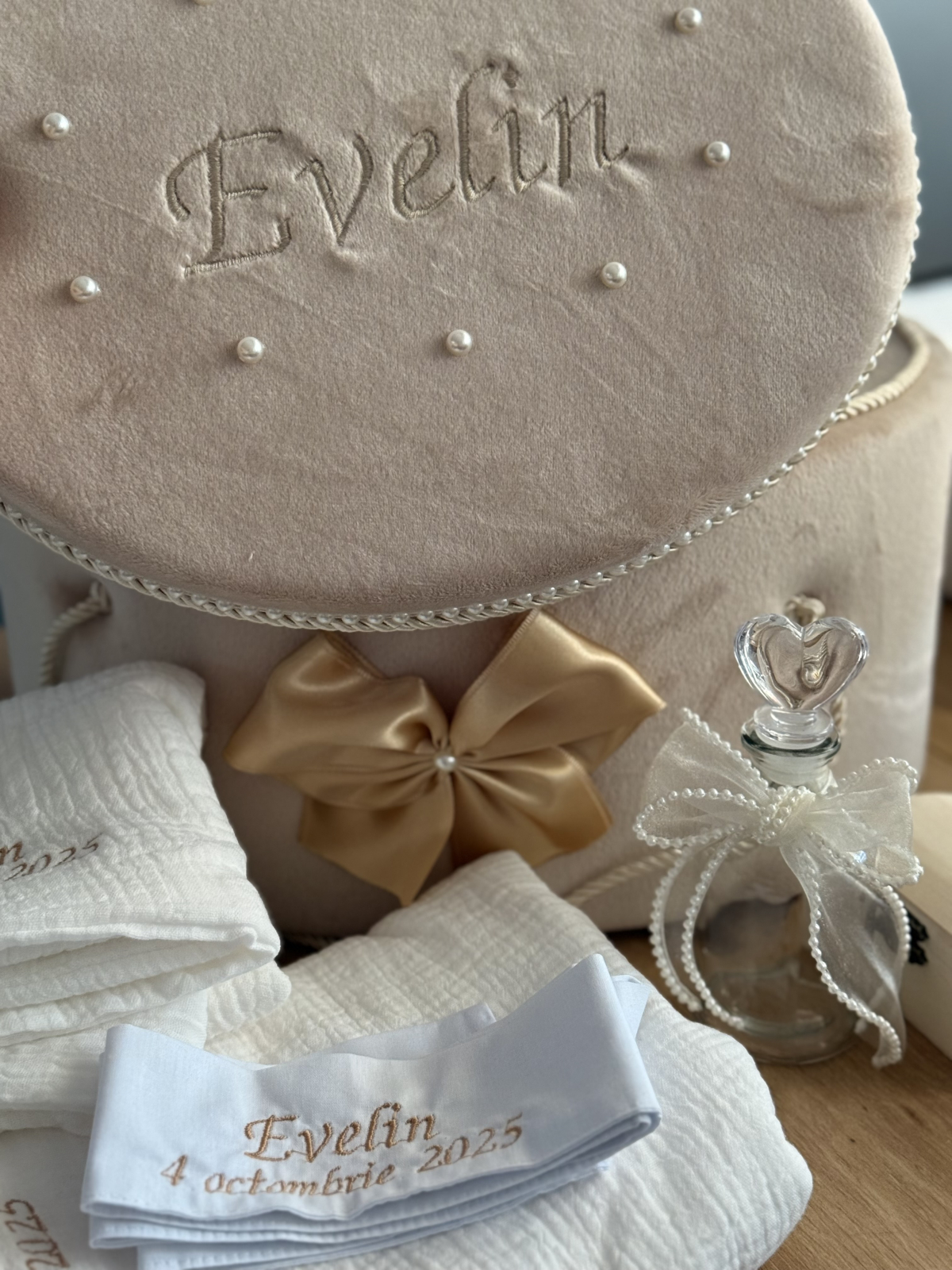 - Cutiuta din lemn pentru șuvița. Aceasta este necesara pentru a pastra suvita bebelusului la tunderea parului – pruncul este tuns in numele Sfintei Treimi – un ritual care simbolizeaza intrarea trupeasca in randul Bisericii.