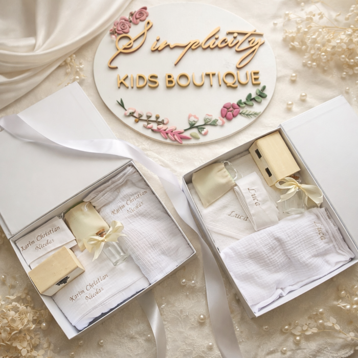 - Cutiuta din lemn pentru șuvița. Aceasta este necesara pentru a pastra suvita bebelusului la tunderea parului – pruncul este tuns in numele Sfintei Treimi – un ritual care simbolizeaza intrarea trupeasca in randul Bisericii.